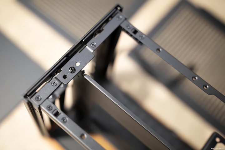 取下通盘面板后,机箱里面呈现操纵分仓的框架式结构。中远隔板也进行了优化,大面积的的开孔不仅优化了散热还能为装机走线预留合理空间。