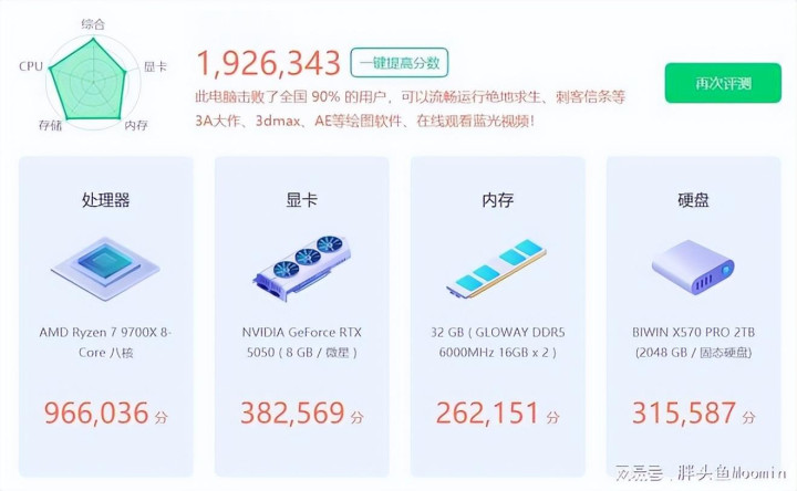 我配置的这套9700X+5050 OC魔龙的主机性能如故终点可以的,鲁众人评测的得分达到了192W。