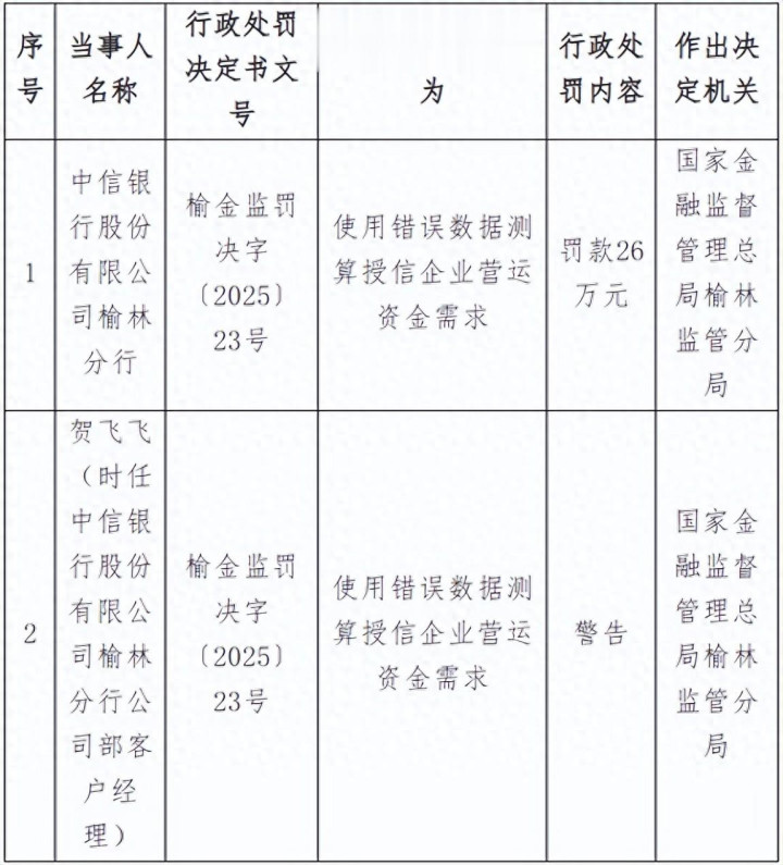 《银行科技接头社》讯息:近日,金融监管总局榆林监管分局发布的行政处罚信息线路,中信银行榆林分行因“使用间隙数据测算授信企业营运资金需求”,被罚金26万元。