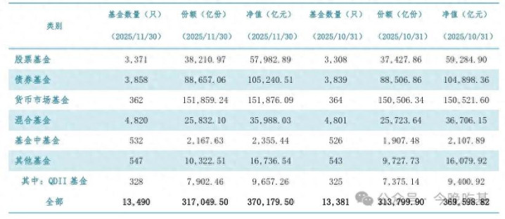12月29日,基金业协会发布了限制2025年11月底的公募基金最新数据。在新的统计口径下,不管是股票型、债券型、货币基金,如故混杂型、FOF和其他类型居品,份额完全增长——整个公募基金的总范围仍是冲到37.02万亿元,又创了历史新高。