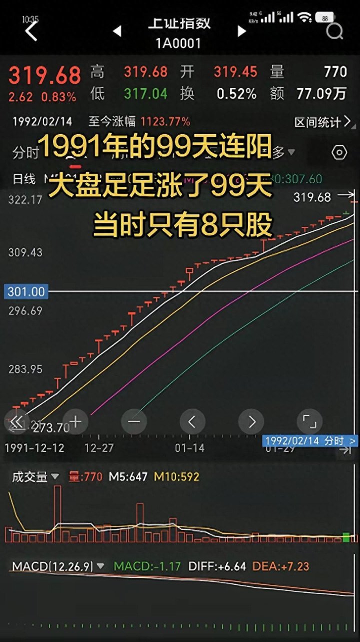行情始于1991年10月3日,终于1992年2月24日。上证指数从181.55点近邻起步,总共攀升至360.5点,区间累计涨幅达到99.26%,被商场普通歌咏为皆集99个往返日收盘高潮。可是,这波惊东谈主高潮仅是序幕,随后的1个月、3个月和6个月内,沪指又差异兑现了5.15%、272.64%和154.80%的涨幅,透顶点火了A股历史上的第一个大牛市。