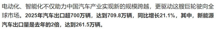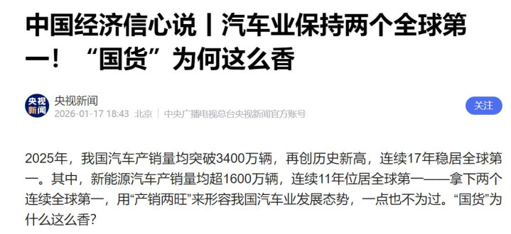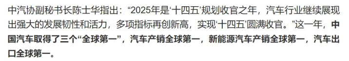 2025年,中国汽车贯串创下三项全球第一,产量第一、销量第一、出口第一。这是硬通的三冠王,是任何再插嗫的西方分析师皆无法否定的事实。