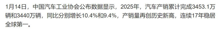 据中国汽车工业协会裸露,2025年我国全年汽车产量为3453.1万辆、销量3440万辆,比前年还大幅增长了10.4%与9.4%。这也曾是我们贯串17年全球第一了。