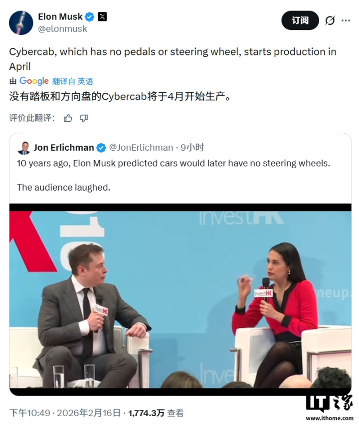 IT之家2月17日音讯,特斯拉首席实行官埃隆·马斯克再次重申了特斯拉Cybercab(赛博出租车)的出产时刻表,再次体现出他对公司随意扫尾这款车型激进投产规划的信心。