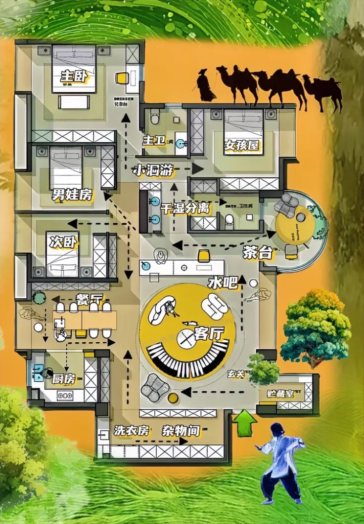 老先人的眼神确凿毒啊,160㎡没差的,玄关嘎了,大横厅,上通使命台,下藏洗衣房,布局照样跃然纸上,动线也好意思翻了!
