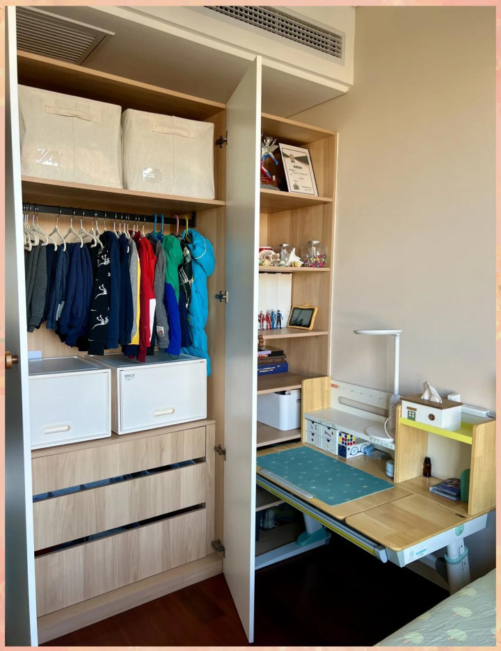 儿童房,不作念“满员”定制。 与其作念幼稚的满墙衣柜书桌,不如用可盘曲层板的衣柜+孤独书桌+生动的书架组合。孩子小技能,衣柜基层一起挂当季衣物,便捷他我方拿取;书桌区域不错空出来放玩物垫。长大了,诊疗层板,加多挂衣区,书桌认真上岗。产品最佳带轮子,随时不错字据需求再行布局。