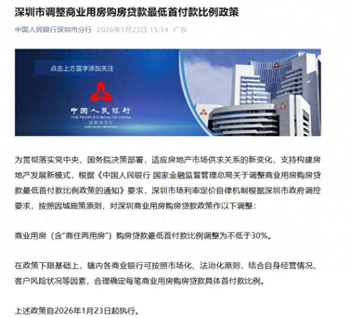 1月23日下昼,中国东谈主民银行深圳市分行发文:生意用房(含“商住两用房”)购房贷款最低首付款比例赞成为不低于30% 。