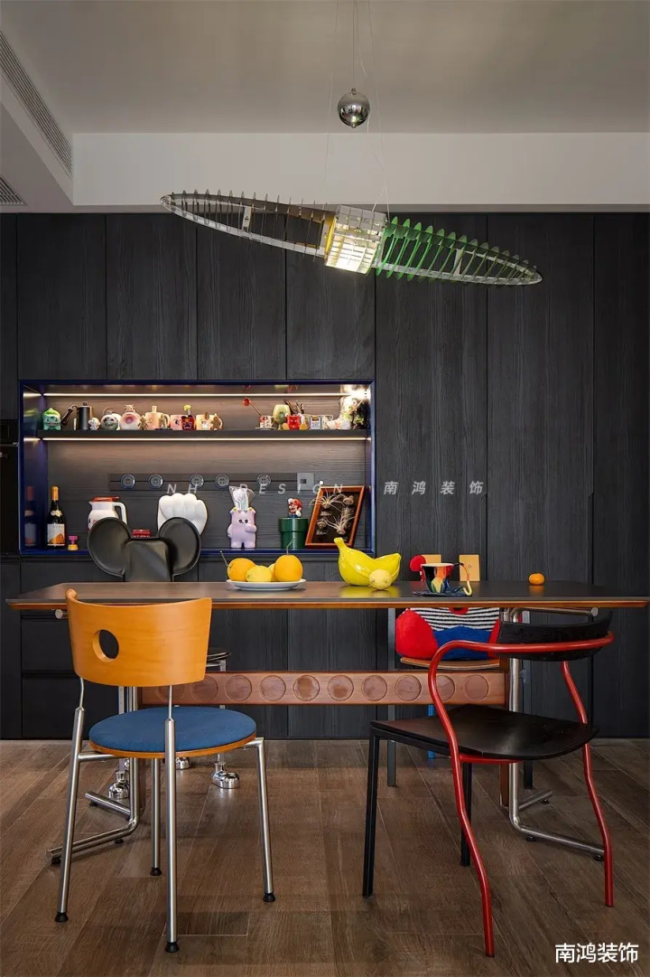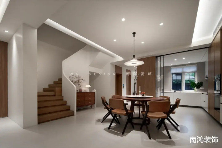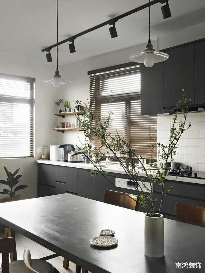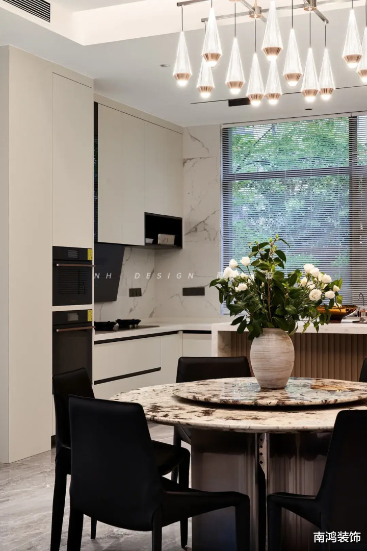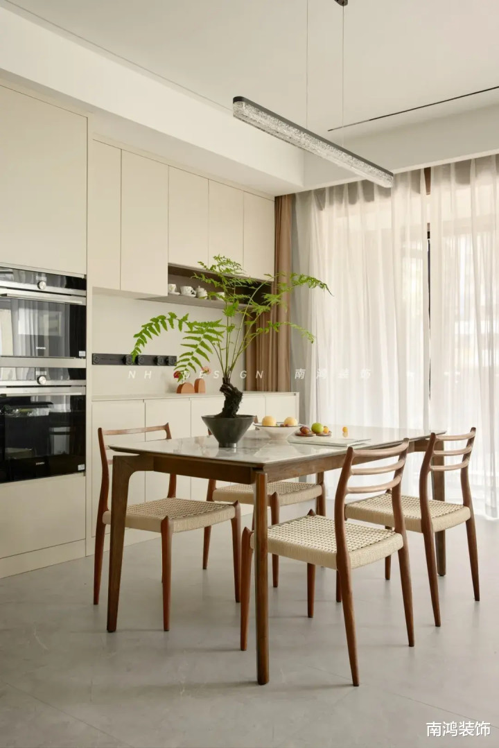 ☞第二种口头是在保管餐厨紧密一语气的基础上,将餐厅分隔为平稳区域,这么就能兼顾时常用餐与多东谈主聚餐的双重需求。