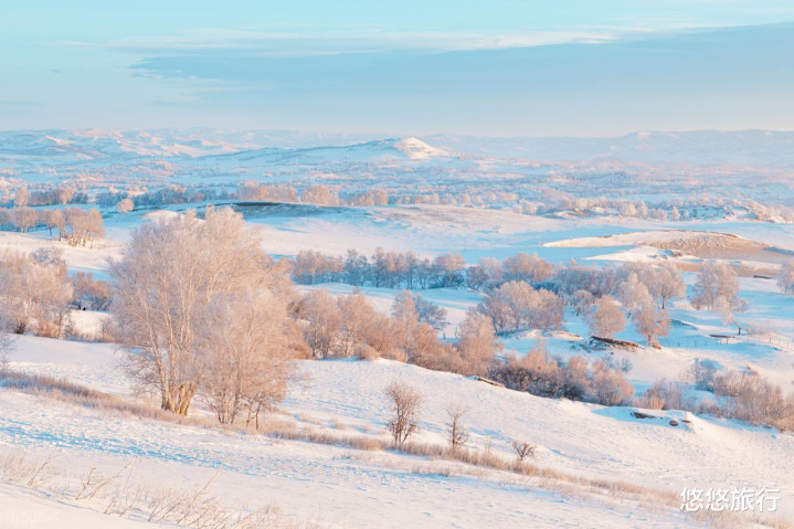 日落余光下黄灿灿的雪山、散着热气的不冻河、日出后漫天匝地的雾凇…都值得来。