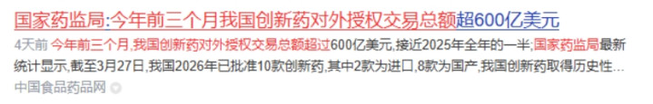 凭据国度药监局公布的数据默契,本年前三个月,我国翻新药对外授权交游总和已超越600亿好意思元,接近2025年全年的一半,标明国产翻新药的全球认同度正加快擢升。